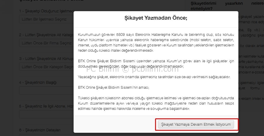 - BTK’nun sitesine üyelik bilgilerinizle giriş yaptıktan sonra şikayet oluşturmak için Şikayet Gönderme Formu linkine tıklayarak şikayet formuna giriş yapıyoruz. Karşımıza açılacak penceredeki kuralları okuduktan sonra şikayet yazmaya devam etmek istiyorum butonuna basıp devam ediyoruz.