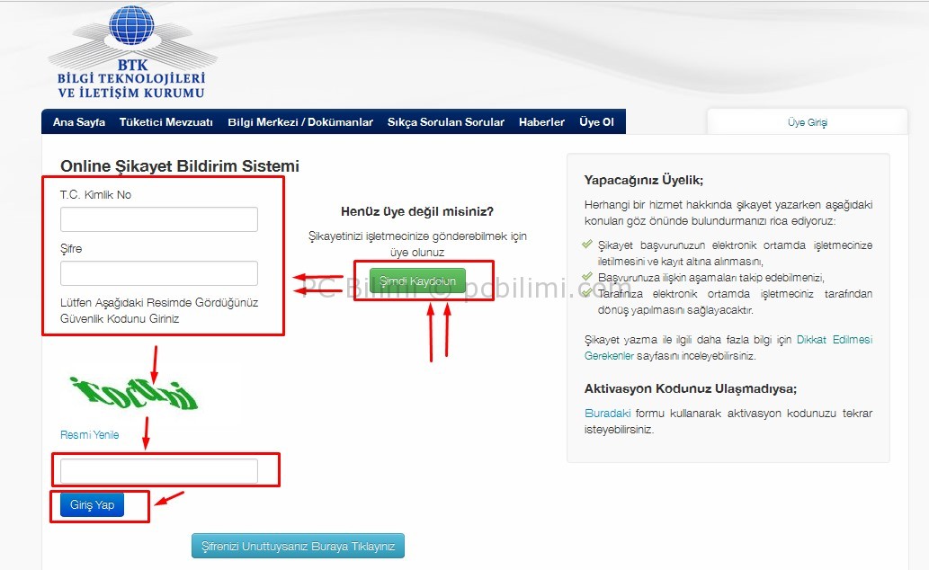 - Öncelikle Bilgi Teknolojileri ve İletişim Kurumuna (BTK) ait resmi web sitesine sikayet.btk.gov.tr adresi üzerinden giriş yapıyoruz. Eğer siteye üyeliğiniz bulunmuyorsa Şimdi Kaydolun butonuyla üye oluyorsunuz. Üyeliğiniz var ise T.C. Kimlik No ve şifrenizle giriş yapabilirsiniz.