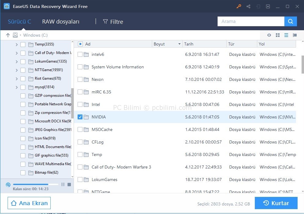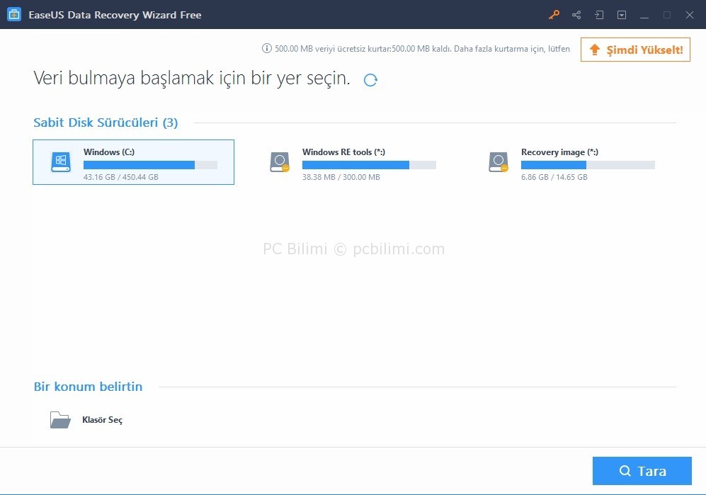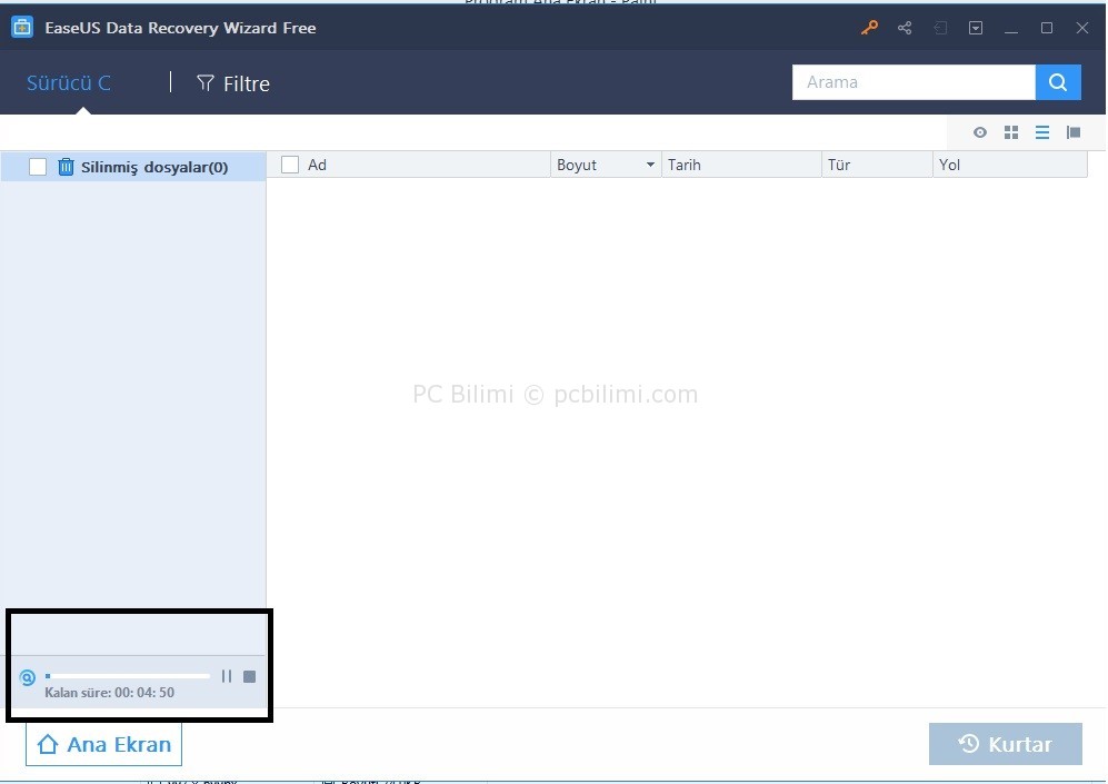 Programı indirmek ve bilgisayarınıza kurmak ücretsiz. Windows ya da macOS işletim sistemine sahip olmanız hiç farketmez ikisi içinde programı aşağıdaki linkten indirebilirsiniz. https://www.easeus.com/datarecoverywizard/free-data-recovery-software.htm Sayfayı açtıktan sonra en üstte ortadaki Free Download butonuna basmanız yeterli, bunun için PC’nizde 30-40 MB arası yer olması yeterli. Yazılımı indirdikten sonra kurulumunu gerçekleştirin. Kurulumu tamamladıktan sonra programı çalıştırın aşağıdaki ekrandan kurtarma yapmak istediğiniz diski seçin. İşletim sistemi C diskinde kuruluysa çöp kutusundan sildiğiniz dosyalarda o disktedir.  Diski seçtikten sonra ekranın alt kısmındaki Tara butonuna tıklayın ve tarama işlemini başlatın. Tarama hızlı ve derinlemesine olarak ikiye ayrılıyor. Bilgisayarı didik didik tüm dosyalarını aramak istiyorsanız derinlemesine tarama modunu seçin. Hızlıca silinen dosyaları geri getirmek istiyorsanız bunu yapmanıza gerek yok.