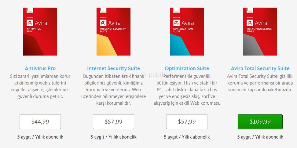 Sizi zararlı yazılımlardan korur etkinlenmiş web sitelerini engeller alışveriş işlemlerinizi güvenli duruma getirir. Avira sizi virüslere ve diğer zararlı yazılımlara karşı korur, casus yazılımları ve reklam yazılımlarını kaldırır. Avira Tarayıcı Güvenliği Uzantısı ile birlikte gizlilik araçları ve arama sonuçlarınıza yönelik güvenlik derecelendirmeleri sunulur. Avira Antivirus Pro, Internet Security Suite, Optimization Suite, Total Security Suite 2019 seçenekleriyle geliyor.
