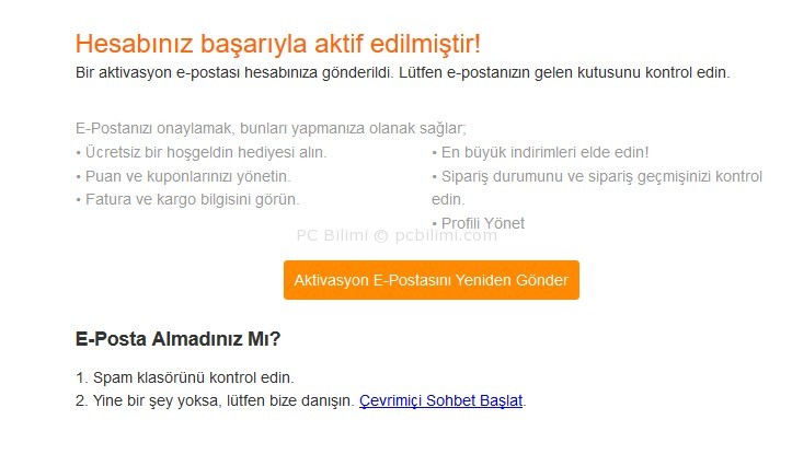 E-posta kutunuza mail gelmezse spam klasörünüzü kontrol edin. Eğer hala mail ulaşmadıysa tekrar aktivasyon maili isteyebilirsiniz. Gönderilen aktivasyon mailinin ulaşması birkaç dakikayı bulabilir.