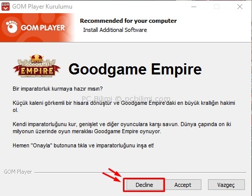 Resimdeki işlemleri yaptığınızda sisteminize gereksiz olarak Yandex uygulamaları ve Goodgame Empire isimli gereksiz yazılım yüklenmeyecektir. Sonrasında işleminizi başarıyla sonlandırabilirsiniz. GOM Player yükledikten sonra çıkan tüm güncellemelerde otomatik olarak size uyarı verecek yükleyip yüklemeyeceğinizi seçmeniz isteyecektir.