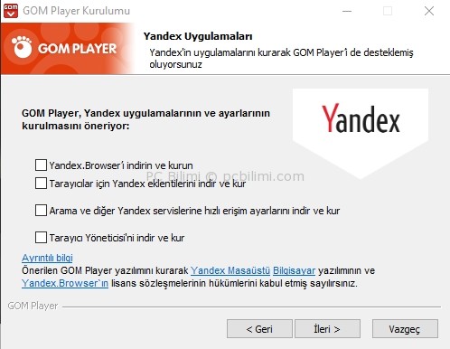 Resimdeki işlemleri yaptığınızda sisteminize gereksiz olarak Yandex uygulamaları ve Goodgame Empire isimli gereksiz yazılım yüklenmeyecektir. Sonrasında işleminizi başarıyla sonlandırabilirsiniz. GOM Player yükledikten sonra çıkan tüm güncellemelerde otomatik olarak size uyarı verecek yükleyip yüklemeyeceğinizi seçmeniz isteyecektir.