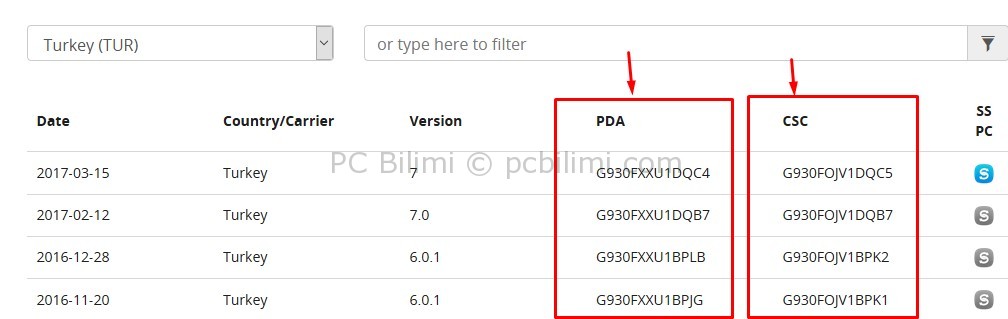 - PDA, CSC, Phone: Bu kodlar telefona yüklü yazılımla alakalı kodlardır. Her android sürümüne ait farklı PDA ve CSC kodları mevcuttur. Doğru kodlara ulaşmak için sammobile.com/firmwares/ adresine gittikten sonra model numarasını aratıp indirmek istediğiniz sürüme ait CSC, PDA, Phone değerlerine ulaşabilirsiniz.