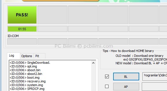 9. İşlem bittikten sonra Odin ekranında PASS şeklinde yeşil bir onay görülecek cihazınız yüklemesini tamamlamak için kapanıp açılacaktır.