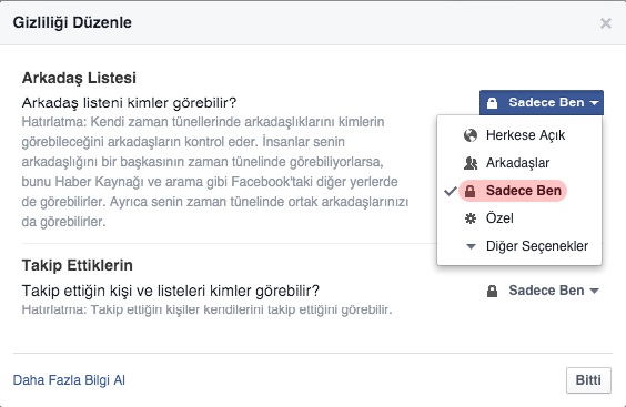 • Arkadaş listeni kimler görebilir? kısmından gizliliği Sadece Ben, Arkadaşlar ya da Herkes şeklinde ayarlayabilirsiniz.