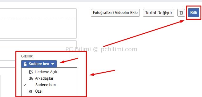 4. Gizlilik seçeneğine tıklayarak arkadaşlar veya sadece ben olarak dileidğinizce ayarlayabilirsiniz.