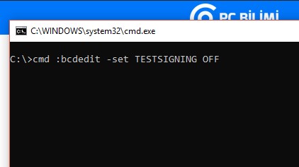 3. Açılan komut satırı ekranına cmd :bcdedit -set TESTSIGNING OFF yazarak Enter butonuna basın.