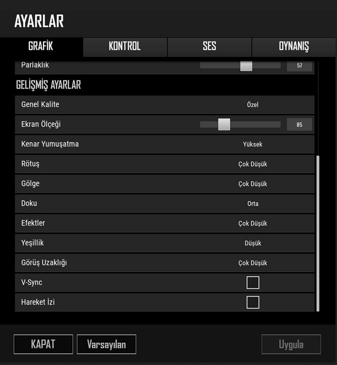 PUBG ile ilgili gerekli sistem gereksinimlerini buraya tıklayarak öğrenebilirsiniz. Oyunla ilgili deneyebileceğiniz oyun ayarlarını aşağıdaki gibi ayarlayabilirsiniz. Aşağıda resimde görünen farklı seçeneklerden birini kullanabilirsiniz.