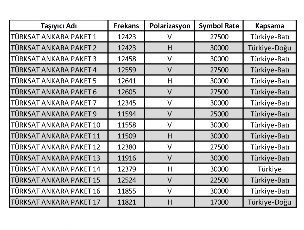 Bu yenilik kapsamında şebeke tarama hizmetinden faydalanmak için, bulunduğunuz kapsama alanına göre aşağıdaki tabloda verilen herhangi bir frekans kullanılabilecektir. Uydu alıcısının “Kurulum” veya “Ayarlar” menüsünden, “Tek Kanal Arama” alt menüsünde, “Uydu” kısmında “Türksat 42° E” ve Türksat Ankara Paket parametrelerini manuel olarak girilerek, “Şebeke Arama” (Network Search) açık seçilmelidir. Otomatik tarama sonucunda, güncel kanal bilgileri uydu alıcınıza eklenmektedir. Uydu kurulumları markalara ve cihazlara göre değişiklik göstermektedir.