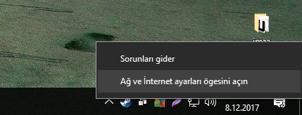 - Saatin yanındaki ağ simgesine sağ tıklıyoruz ve açılan menüde Ağ ve Paylaşım Merkezini Aç seçeneğine tıklıyoruz.