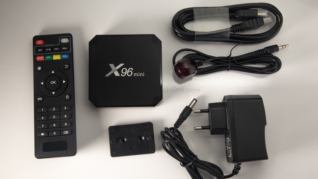 Gearbest üzerinden satın almış olduğumuz ürününün kutusunu incelediğimizde kutu içeriğinde sizleri X96 Mini’nin dışında 1 adet HDMI kablosu, 1 adet IR uzaktan kumanda, 1 adet güç adaptörü, 1 adet yapışkanlı montaj ayağı, 1 adet kullanım kılavuzu (İngilizce) karşılıyor. Cihazın uzaktan kumandası 2 adet 1.5V’luk AA pille çalışıyor. Ancak kutu içeriğinden pil çıkmıyor.. Pilleri kendiniz temin etmeniz gerekmektedir.