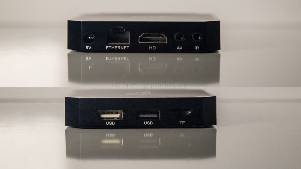 X96 Mini’nin giriş/çıkış birimlerini cihazın en ön yüzünde cihazın anlık durumunu belirten kırmızı/mavi ışıklı bir güç ledi bulunuyor. Cihazın arka kısmına baktığımızda ise 1 adet güç adaptörü yuvası, 1 adet ethernet kablosu girişi, 1 adet HDMI bağlantı yuvası, 1 Adet AV girişi (eski tip tvler için) ve 1 adet uzaktan kumanda alıcısı (IR) için yuvayla karşılaşıyoruz. Cihazın Sol tarafında ise 2 adet USB girişi ve 1 adet Micro SD kart (TF) yuvası bulunuyor. Cihaz üzerinde ethernet portu olsa bile cihazda dahili Wi-Fi alıcısı bulunuyor. Cihaz boyutları ise 8.20 x 8.20 x 1.70 cm yani en çok kullanılan kalem pilden biraz uzun seviyelerde.